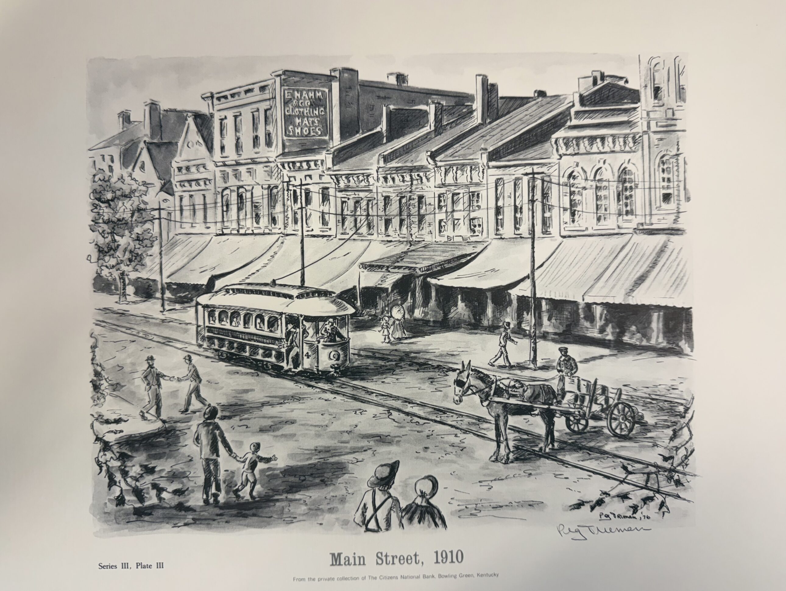 Mule-drawn drays and streetcars, as illustrated, had an important place in the history of Bowling Green. All freight arrived by steamboat packet or trains at the turn of the century, and the dray provided a means of final movements of goods to the desired location. Streetcars were used in Bowling Green from 1889 to 1921.